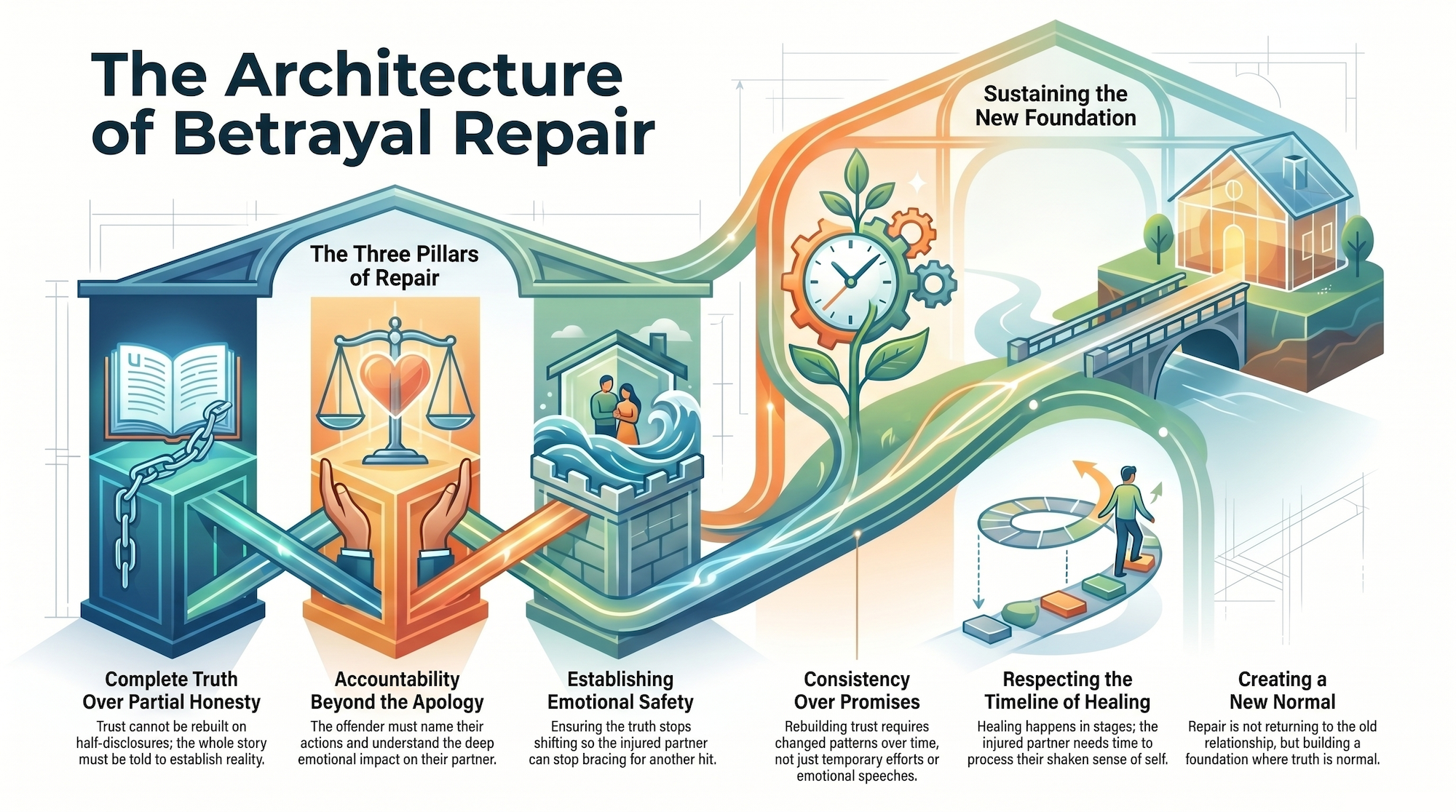 Apr 23, 2026Real betrayal repair is not a quick conversation. It is a process that depends on whether the relationship can become honest, safe, and consistent again. If the deception is still ongoing in any form, repair has not really begun yet. (see a video about betrayal trauma)