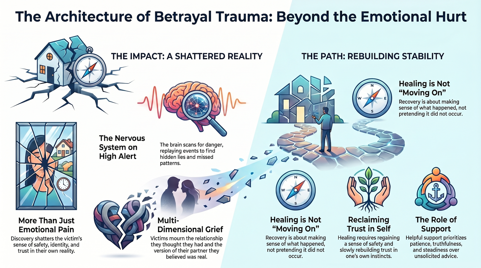 This is why pressure to “move on” usually backfires. Healing after betrayal is not about pretending it did not happen. It is about making sense of what happened, regaining a sense of safety, and slowly rebuilding trust in reality and in themselves.