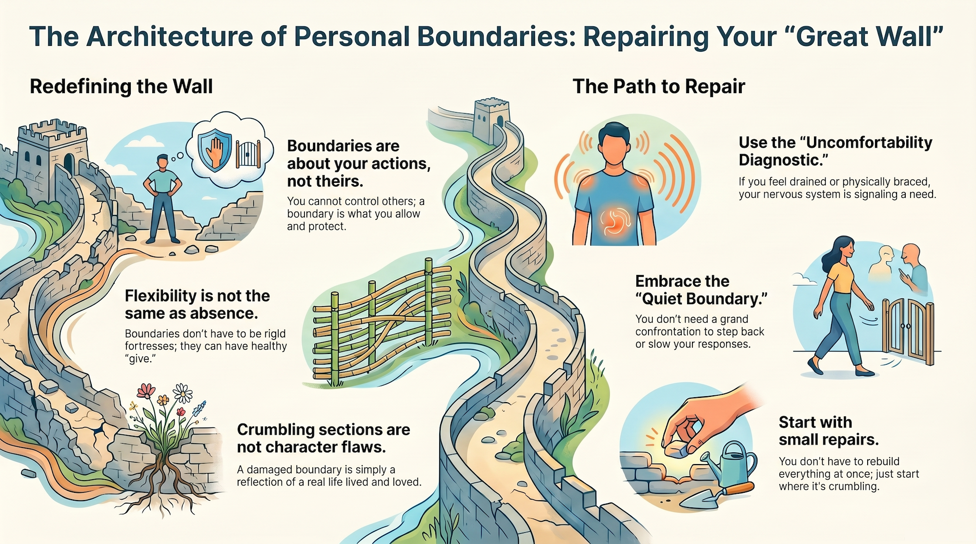That's how our boundaries actually are. Not one uniform, perfectly maintained structure. A long, winding wall across our lives — some stretches solid, some barely hanging on. And that's not a character flaw. That's just what it looks like to be a person who has lived a real life, loved real people, and been hurt in some places more than others.