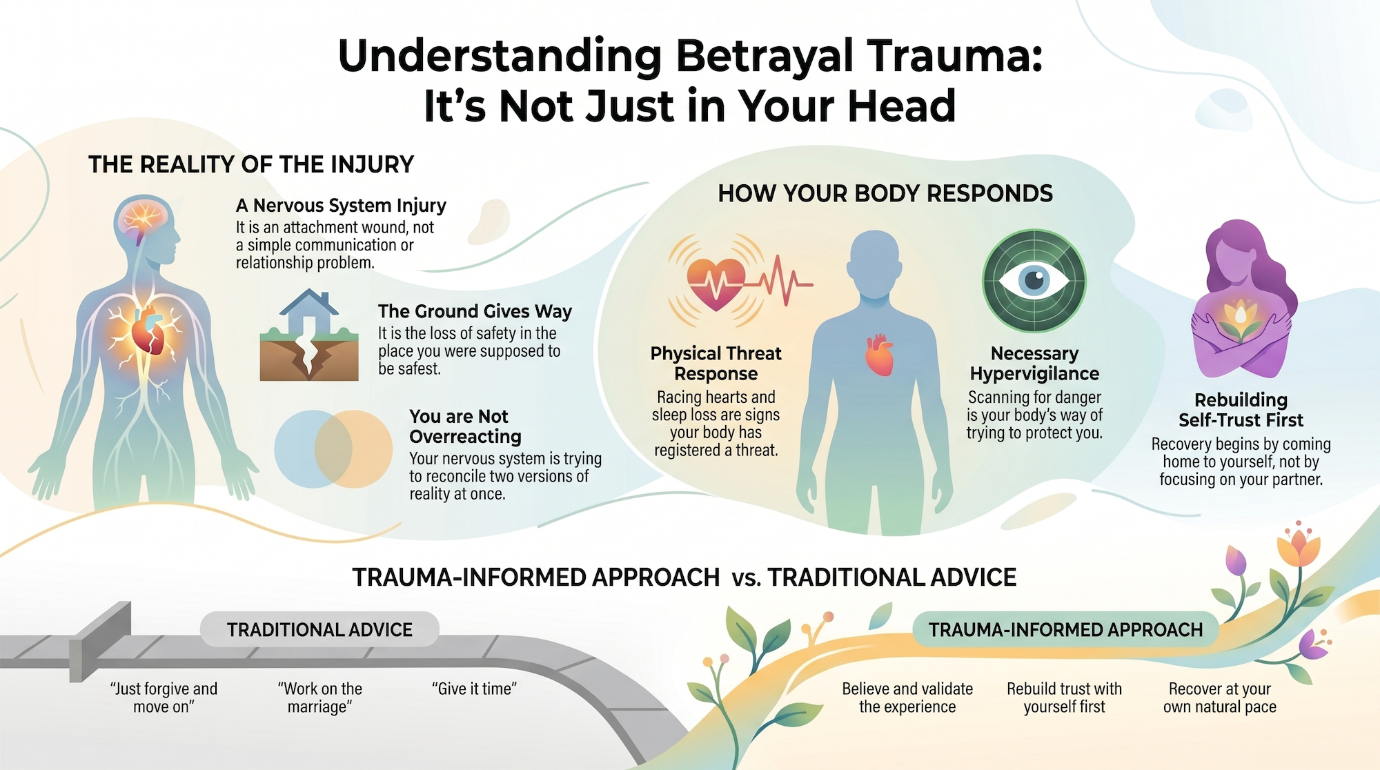 Betrayal trauma is a nervous system injury. It's an attachment wound. It's the loss of safety in the one place you were supposed to be safest — and your body knows it, even when your mind is still trying to make sense of it.