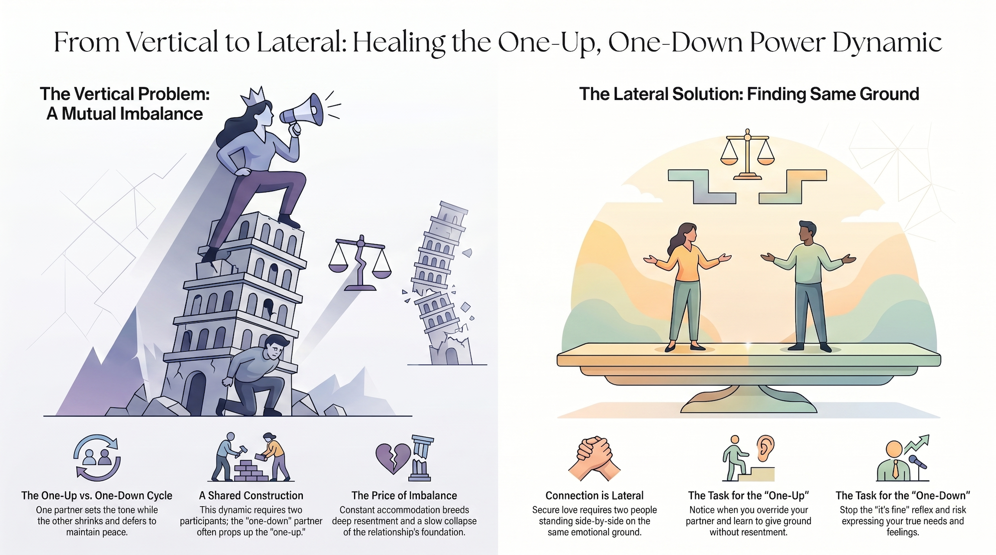 If you're the one-up, the work is hard in a particular way. It's noticing how often you take over. How often you correct, or override, or decide before your partner's finished talking. It's asking yourself what you're actually afraid of when they have a different opinion than yours. It's learning to give ground without resentment.