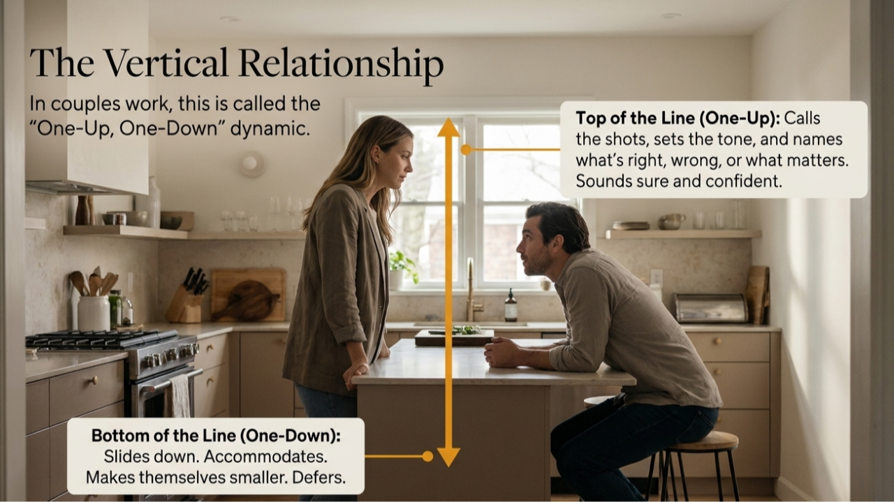 In couples work we sometimes call it a one-up, one-down dynamic. One of you ends up calling more of the shots — setting the tone, naming what's right, what's wrong, what matters. The other one slides down. Accommodates. Makes themselves smaller. Defers.