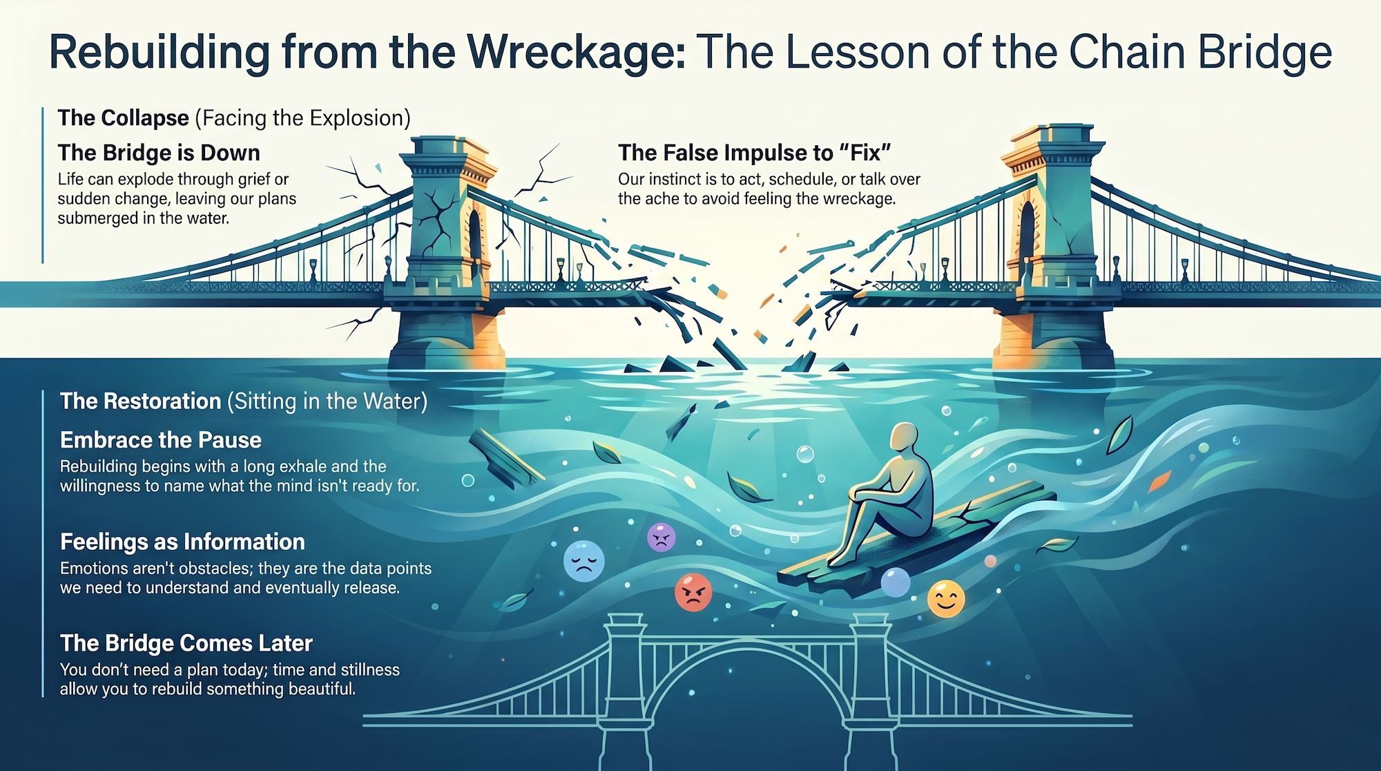 I know. That's not what any of us want to hear. When our lives come apart, the impulse is to act — to fix, to reassure, to move, to schedule, to talk over the top of the ache. To do almost anything except feel what's actually there. But you can't rebuild a bridge while you're still trying to pretend it didn't fall.