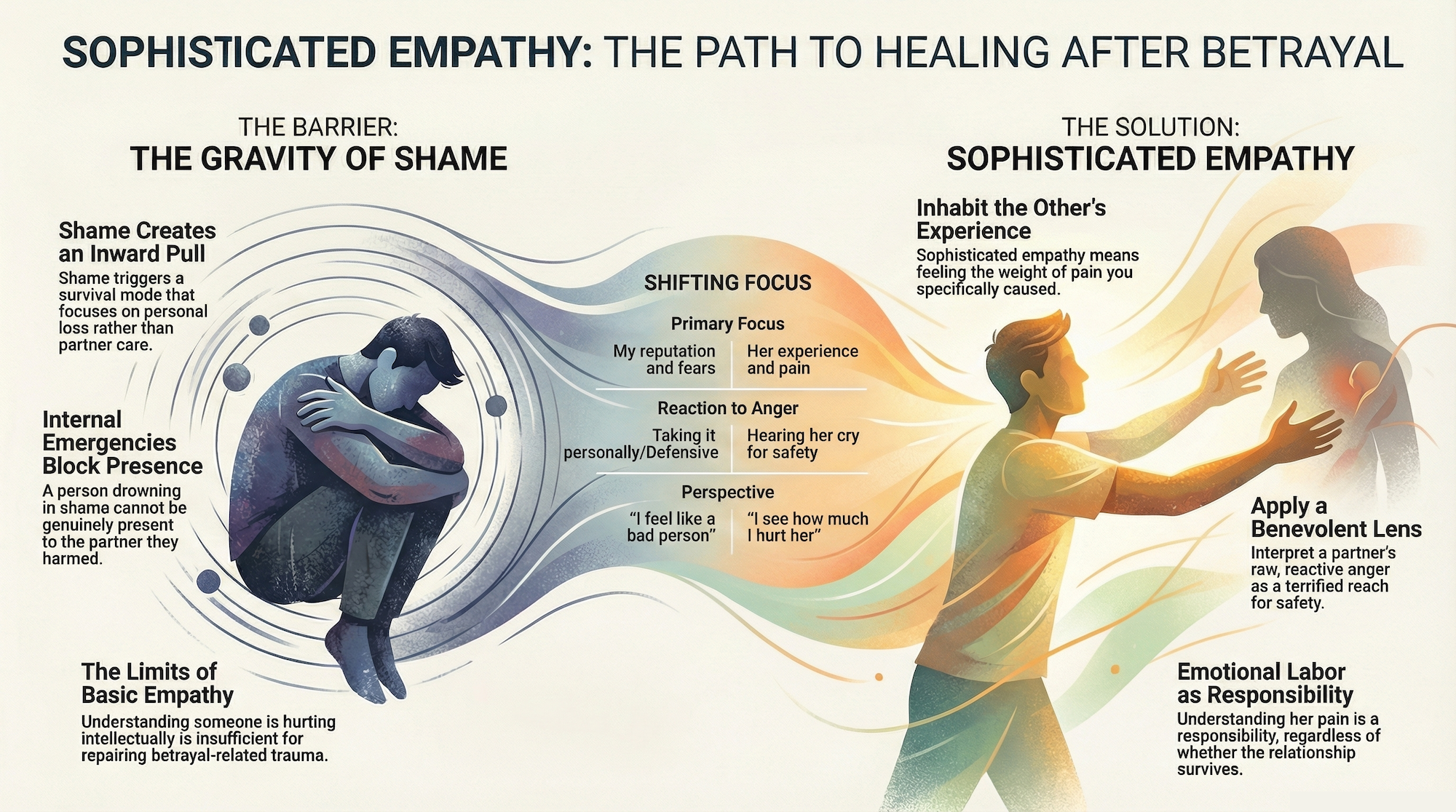 But here's the clinical reality: a man in shame cannot offer sophisticated empathy. He's too busy managing his own internal emergency to be genuinely present to the person he harmed.